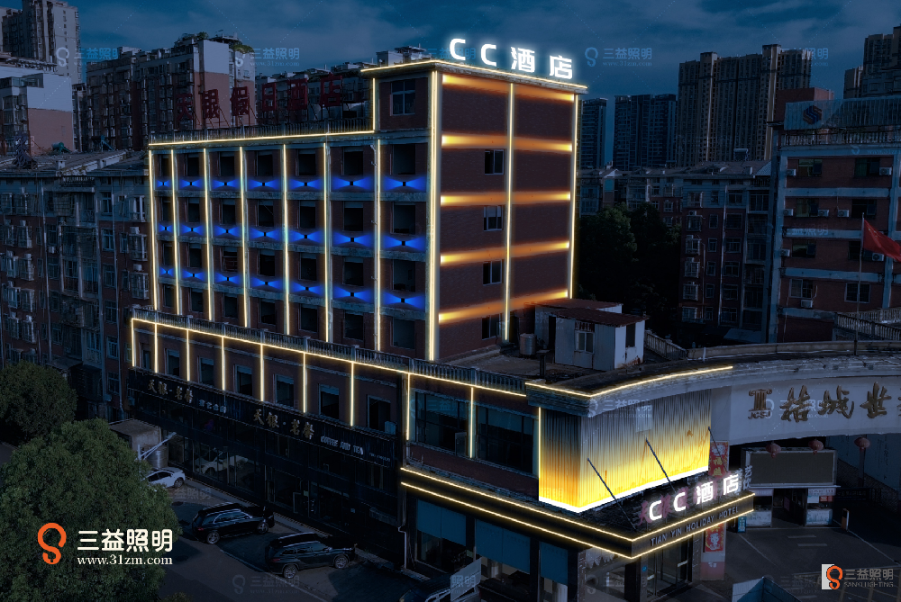 益陽市銀座商務(wù)酒店外墻燈光設(shè)計(jì)項(xiàng)目,本項(xiàng)目采用LED發(fā)光字,LED線條燈,LED十字星燈等燈具,對(duì)外墻進(jìn)行亮化。